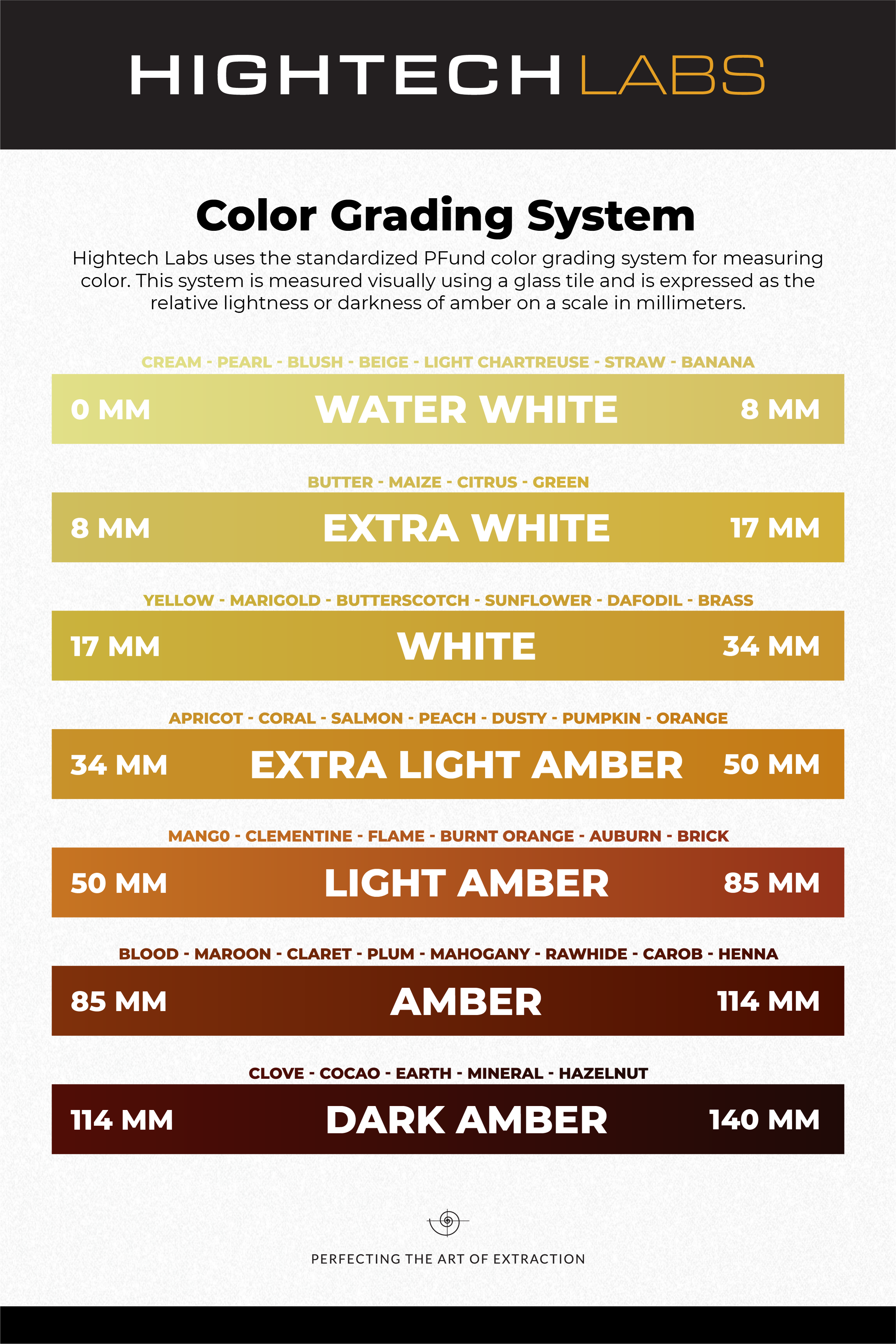 When communicating in a scientific or lab environment it is important to be as literal and precise as possible when communicating. Getting rid of semantics and made up names, we opted to take the more scientific route and measure it. Through research I figured that cannabis extract isn’t too different from honey, and honey has a very established system for this called the PFund Scale.
